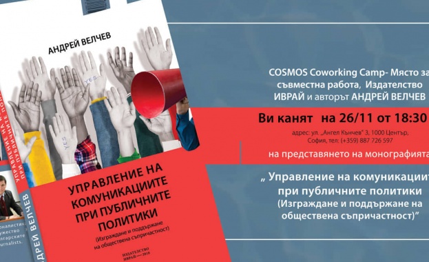 /КРОСС/ Първата си самостоятелна книга представя на 26 ноември от 18,30 ч. политологът Андрей Велчев. Трудът "Управление на комуникациите при публичните политики" ще бъде презентиран в книжарницата на ул. "Ангел Кънчев"