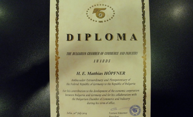 /КРОСС/ Извънредният и пълномощен посланик на Федерална република Германия у нас Матиас Хьопфнер получи почетен диплом от БТПП по повод приключването на мандата му в страната. Отличието е за приноса на Матиас Хьопфнер за развитие на двустранните икономически отношения и ползотворното сътрудничество с БТПП и бе официално връчено от председателя на Палатата Цветан Симеонов. Той изтъкна и заслугите на посланика за подкрепата към Германо-българската търговско-индустриална камара и успешните партньорства.