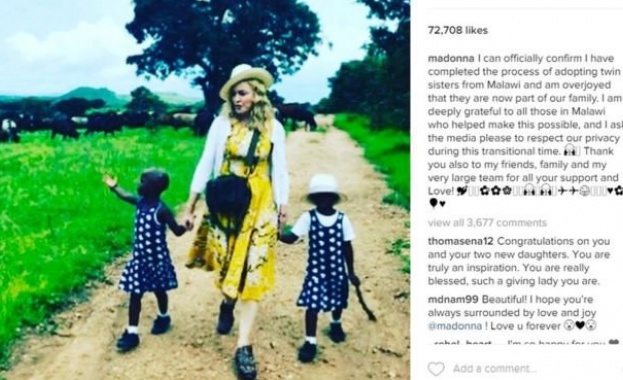 /КРОСС/Мадона обяви, че е приключила процедурата по осиновяване на близначки от Малави. Двете момиченца вече са част от семейството на звездата.