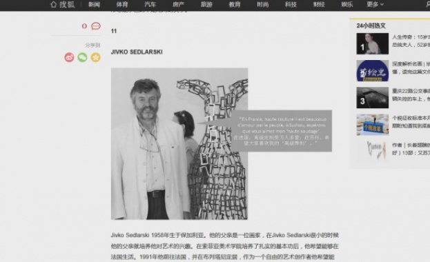 „През 2011 година участвах в европейска изложба в Китай. Тази изложба беше представена в 8 китайски музея. Суджоу е северозападно от Шанхай, на 90 км. Някой ме е забелязал и ме покани да участвам в една надпревара за един парк близо до бреговете на езерото на този град. Две скулптури от моя страна, които спечелиха, след това още една трета и четвъртата ми поръчка: Можеш ли и да нарисуваш нещо на стената и пред мен се представи това предизвикателство да се докажа като рисувач. Фреското ще бъде в два пешеходни тунела, които излизат в основата на най-големия небостъргач в Китай, който сега в момента е в строеж - 729 метра", каза Живко. Скулпторът е щастлив, че някъде там ще го има и неговото име, което за него е успех и за България. За така нареченият "критичен" българин Живко Седларски е непознат творец, но това не го притеснява.