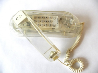 Това е класически модел телефон на компанията Cecina от 80-те години на миналия век. Освен че е прозрачен, другият интересен момент са неоновите светлини, което е нещо изключително популярно за този период.