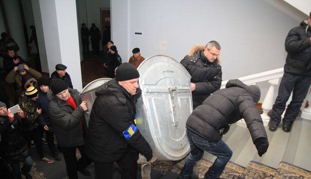 Радикално настроените протестиращи качили в кабинета на областния губернатор контейнер за боклук - символ на лустрацията. В резултат на сблъсъка с кордона, като минимум са пострадали един полицай и един активист.