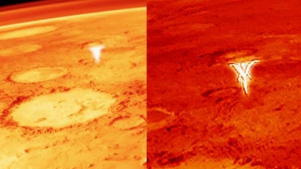 Светещата фигура е заснета в близост до един от кратерите на Марс. На кадрите, до светещия обект, се вижда друг, който прилича на чинийка.