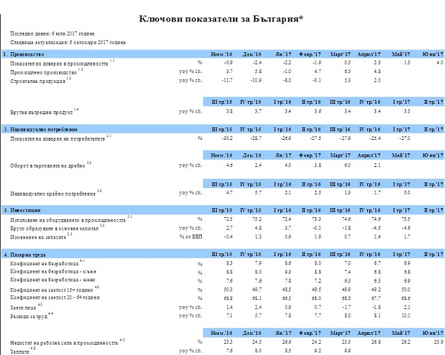 По предварителни данни произведеният брутен вътрешен продукт (БВП) през първото тримесечие на 2017 г. възлиза на 20 066 млн. лв. по текущи цени. На човек от населението се падат 2 826 лв. от стойностния обем на показателя. При среден за тримесечието валутен курс от 1.83625 лв. за 1 щатски долар БВП възлиза на 10 928 млн. долара и съответно на 1 539 долара на човек от населението. Преизчислена в евро, стойността на БВП възлиза на 10 260 млн. евро, като на човек от населението се падат 1 445 евро. Сезонно изгладените данни показват растеж от 3.5% на БВП през първото тримесечие на 2017 г. в сравнение със съответното тримесечие на предходната година и 0.9% спрямо четвъртото тримесечие на 2016 година.