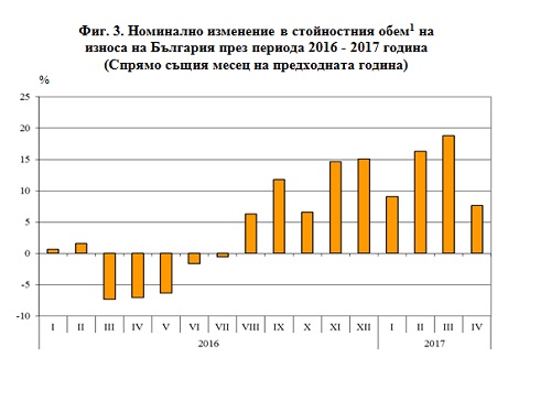 През април 2017 г. износът на България за трети страни нараства с 28.3% спрямо същия месец на предходната година и е в размер на 1 409.6 млрд. лева.