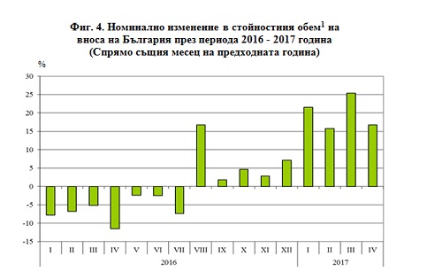 През периода януари - април 2017 г. в страната са внесени стоки общо на стойност 18 627.4 млн. лв. (по цени CIF), или с 19.9% повече спрямо същия период на 2016 година.