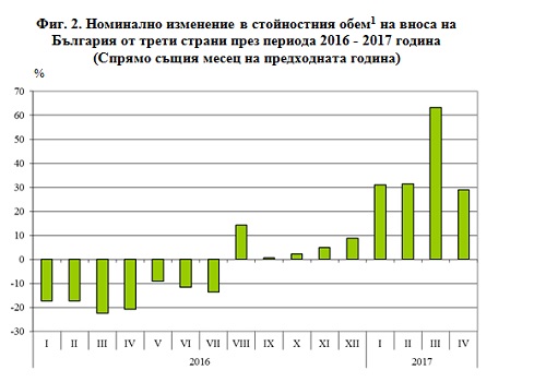 През април 2017 г. вносът на България от трети страни нараства с 29.0% спрямо същия месец на предходната година и е в размер на 1 706.8 млрд. лeвa.