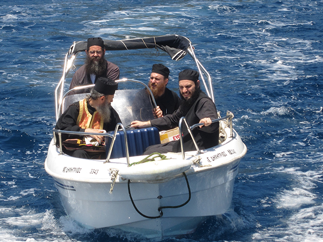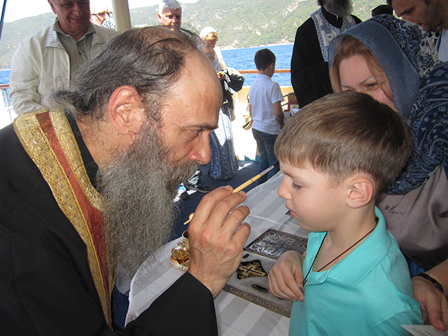 Докато съзерцавахме манастирите, изведнъж корабът ни се приближи до брега на по-малко от позволените 500 м растояние! Дали не съгрешихме? Не, това беше, за да улесним монасите, които пътуваха към нас с малка лодка от манастира Ксенофонт. Носеха нещо в огромен син куфар – мощите на 9 светии за молебена и светата литургия, която се проведе на кораба. За три часа и половина морският съд се превърна в храм!