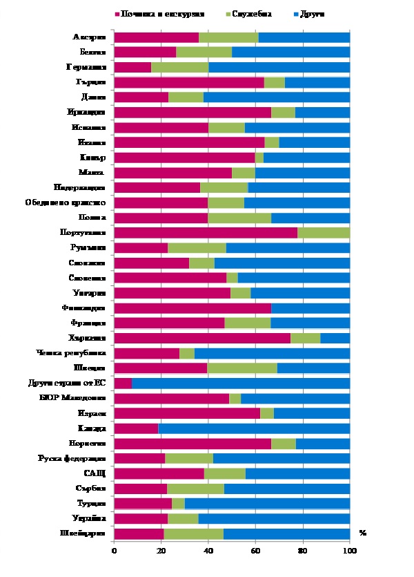 През август 2017 г. с други цели са били 70.2% от пътуванията към Турция и 66.0% - към Чешката република. Пътуванията с цел почивка и екскурзия към Италия и Гърция са съответно 64.1 и 63.8% от всички реализирани пътувания на български граждани към тези страни (фиг. 2).