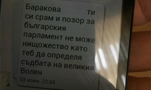 "Баракова, ти си срам и позор за българския парламент. Не може нищожество като теб да определя съдбата на великия Волен", гласи съобщението, изпратено на мобилния на депутатката.