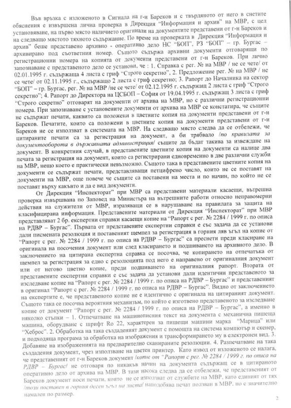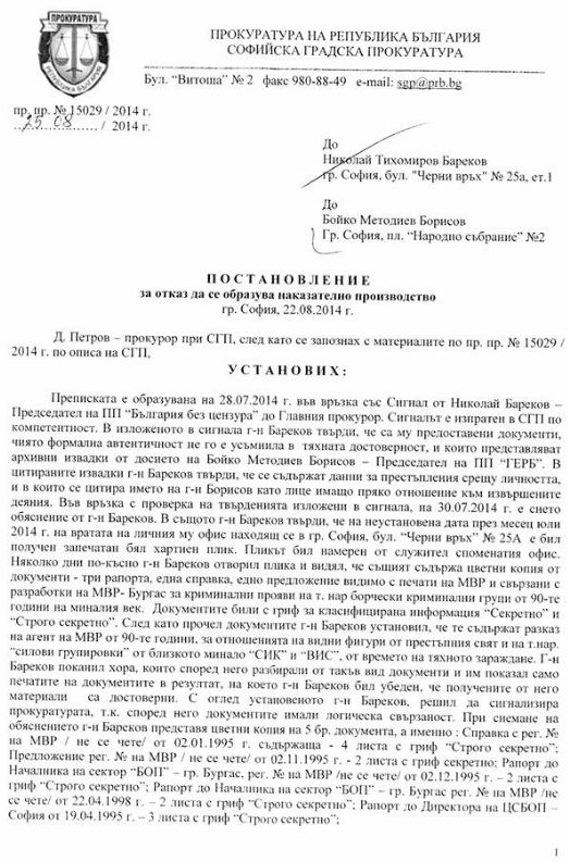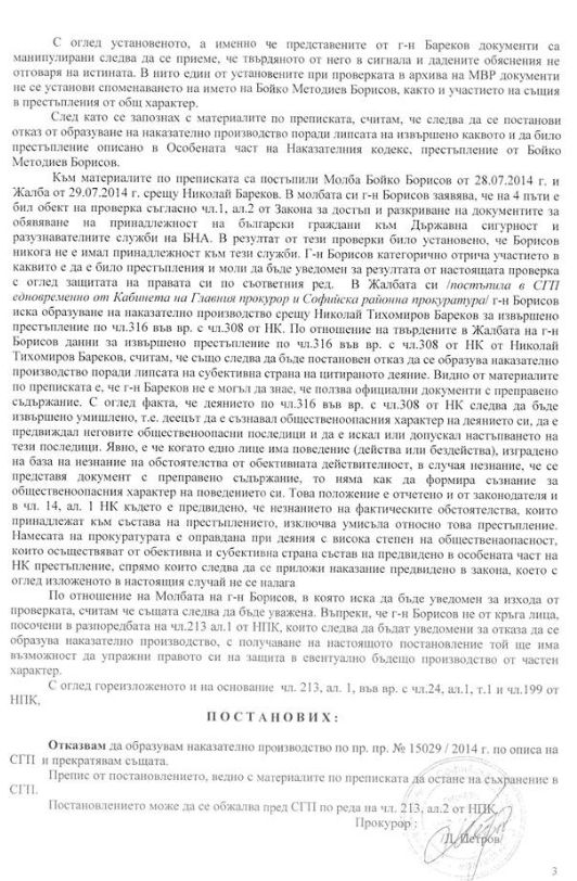 В публикуваното от Бойко Борисов постановление пише, че документите, представени от Бареков са манипулирани. В оригиналите нямало такива печати, а и било невъзможно да има, никъде не се споменавало името на Бойко Методиев Борисов.
