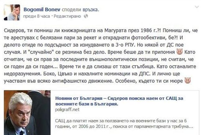 "Сидеров, ти помниш ли книжарницата на Магурата през 1986 г.?! Помниш ли, че те арестувах с белязани пари за рекет и откраднати фотообективи, бе?! И делото отиде по подсъдност за изнудването в 3-о РПУ. Но някой от ДС пое случая. И "случайно" се резмина без дело", написа Бонев на страницата си във Фейсбук.