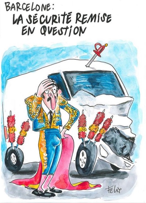 Малко преди това се появи карикатура, поместена в сайта на изданието, на която е запечатан белият миниван със смачкан преден капак. До него, държейки се за главата и стискайки в ръце червен плащ, стои тореадор. В гумите и покрива на автомобила са забити шпаги и копия - инструменти на участниците в кориди. „Барселона: безопасността отново е под въпрос" - това е надписът, съпровождащ карикатурата.