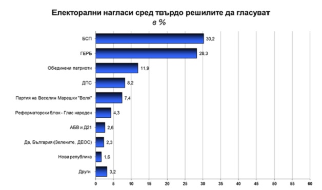 /КРОСС/ Силите на БСП и ГЕРБ продължават да са изравнени, а формулата на влизащите в парламента партии от днешна гледна точка е 5+1. Това показва допитване на „Галъп интернешънъл“. Сред твърдо решилите да гласуват за политическа сила или кандидат, 30,2% казват, че ще подкрепят БСП, за ГЕРБ биха гласували - 28,3%, за Обединените патриоти - 11,9%, за ДПС - 8,2%, за партията на Веселин Марешки ВОЛЯ - 7,4% и за коалицията „РБ - „Глас народен" - 4,3%. Тези формации биха попаднали в следващото Народното събрание от днешна гледна точка, като при Реформаторите ще се наложи много усилена кампания, тъй като са с резултат около бариерата.
