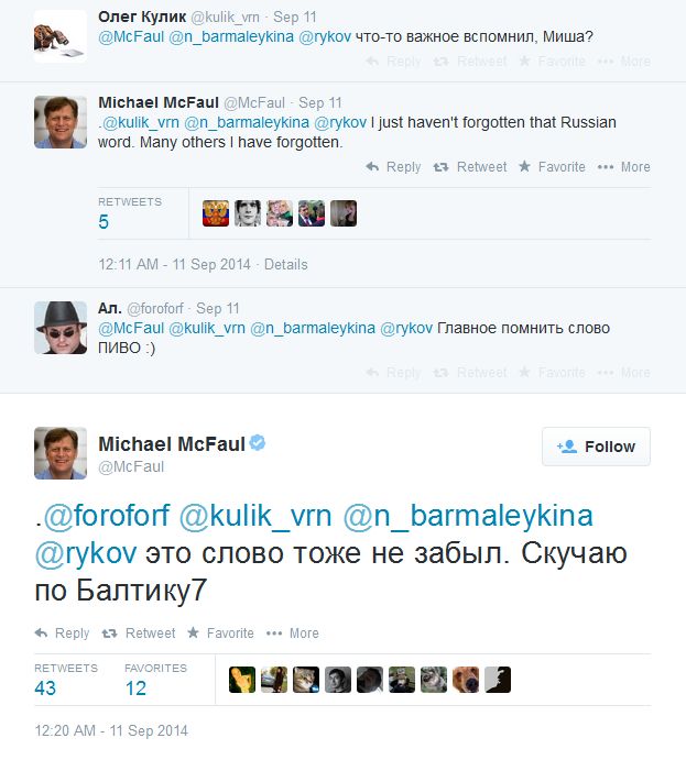 /КРОСС/ Бившият посланик на САЩ в Русия Майкъл Макфол със съжаление отбелязва, че е започнал да забравя руския език. Някои думи обаче, свързани с приятни спомени от страната, са се запечатали в паметта му.
