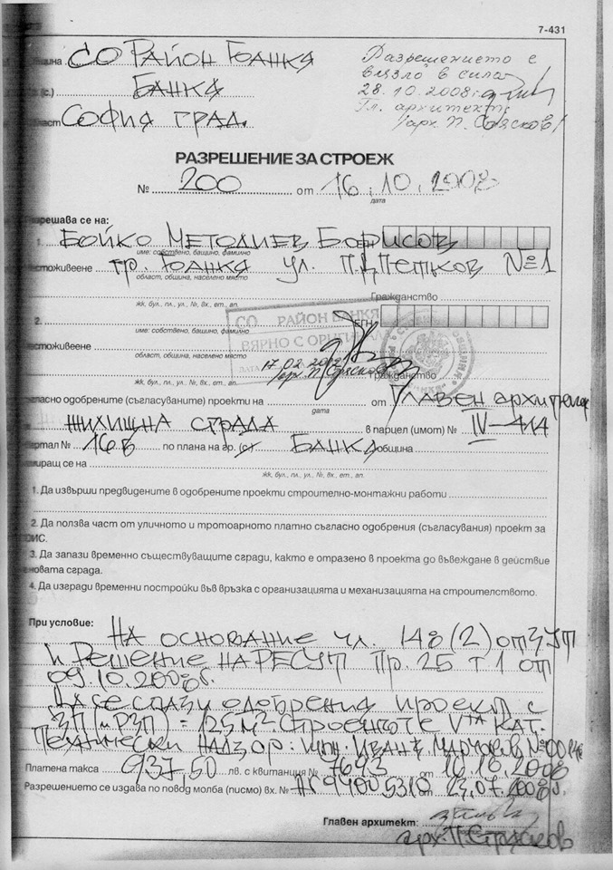 Може да се запознаете с разрешението за строеж на жилищна сграда с РЗП 125 кв. м. от 16.10.2008 г. на името на Бойко Методиев Борисов в Банкя, с удостоверението за въвеждане в експлоатация на същата жилищна сграда, с декларацията пред Сметната палата, както и сателитни снимки на имота.