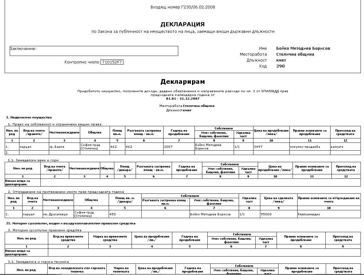От справки в подадените декларации на Бойко Методиев Борисов пред Сметната палата и пред КОНПИ, респ. КПКОНПИ се вижда, че въпросната жилищна сграда не е декларирана.