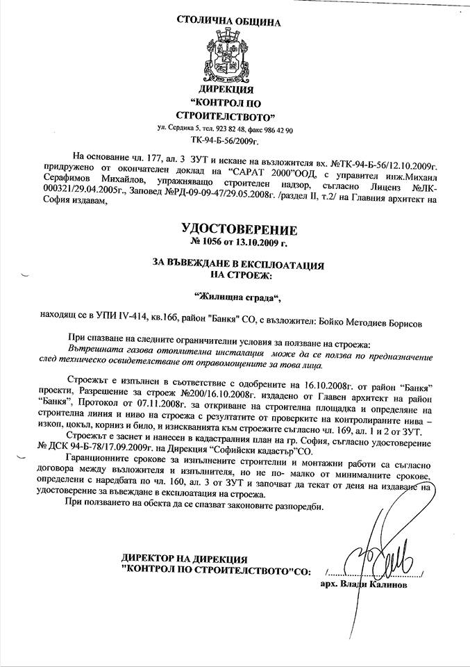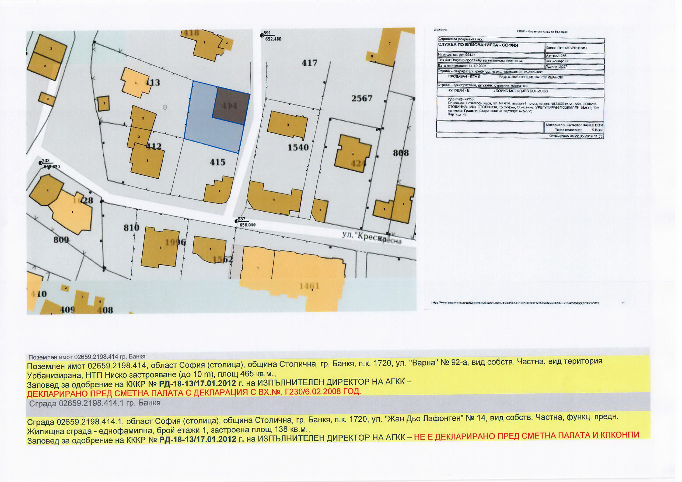 От справка за лице на име Бойко Методиев Борисов от службата по вписвания, в София, за периода 01.01.1992 г. - 22.05.2019 г. няма вписвания, отбелязвания или заличаване по отношение на изградената в гр. Банкя къща. Според службата по вписвания от 2002 г. има констативен акт за мястото и имота, където премиерът живее, както и за пристройка от 38 кв. м. Тази постройка не е въпросната къща от 125 кв. м.