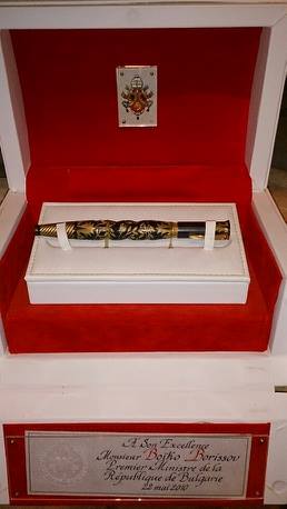 Борисов показа и подаръка си от Папа Бенедикт XVI - миниатюрно копие на една от витите колони на централния олтар в базиликата "Свети Петър", построен през 17-ти век от Джовани Лоренцо Бернини. Копието на колоната е пригодено за писалка, уточнява Борисов.