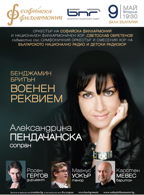 Повече от 220 музиканти от Софийската филхармония, Симфоничният оркестър на Българското национално радио, НФХ "Светослав Обретенов", Смесеният хор на БНР и Детският радиохор ще представят "Военен реквием" на Бенджамин Бритън на 9 май в зала "България" от 19.30 ч. Специално за събитието у нас пристига оперната прима Александрина Пендачанска (сопран), а нейни партньори в соловите партии ще са младият тенор Магнус Уокър (Англия) и Карстен Мевес (баритон, Германия). Диригент ще бъде Росен Гергов, който под палката си ще обедини двата най-големи наши симфонични състава, изключително рядко заставали на една сцена до сега.