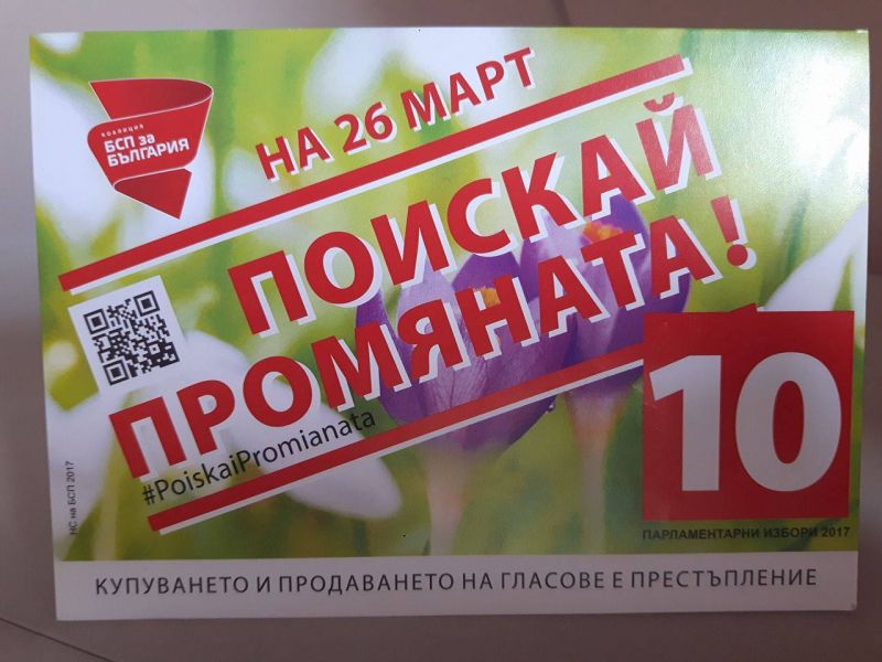 Мотото на червената предизборна кампания е „Поискай промяната!". Чрез цветна картичка с минзухари социалистите призовават #PoiskaiPromianata на 26 март с бюлетина номер 10.