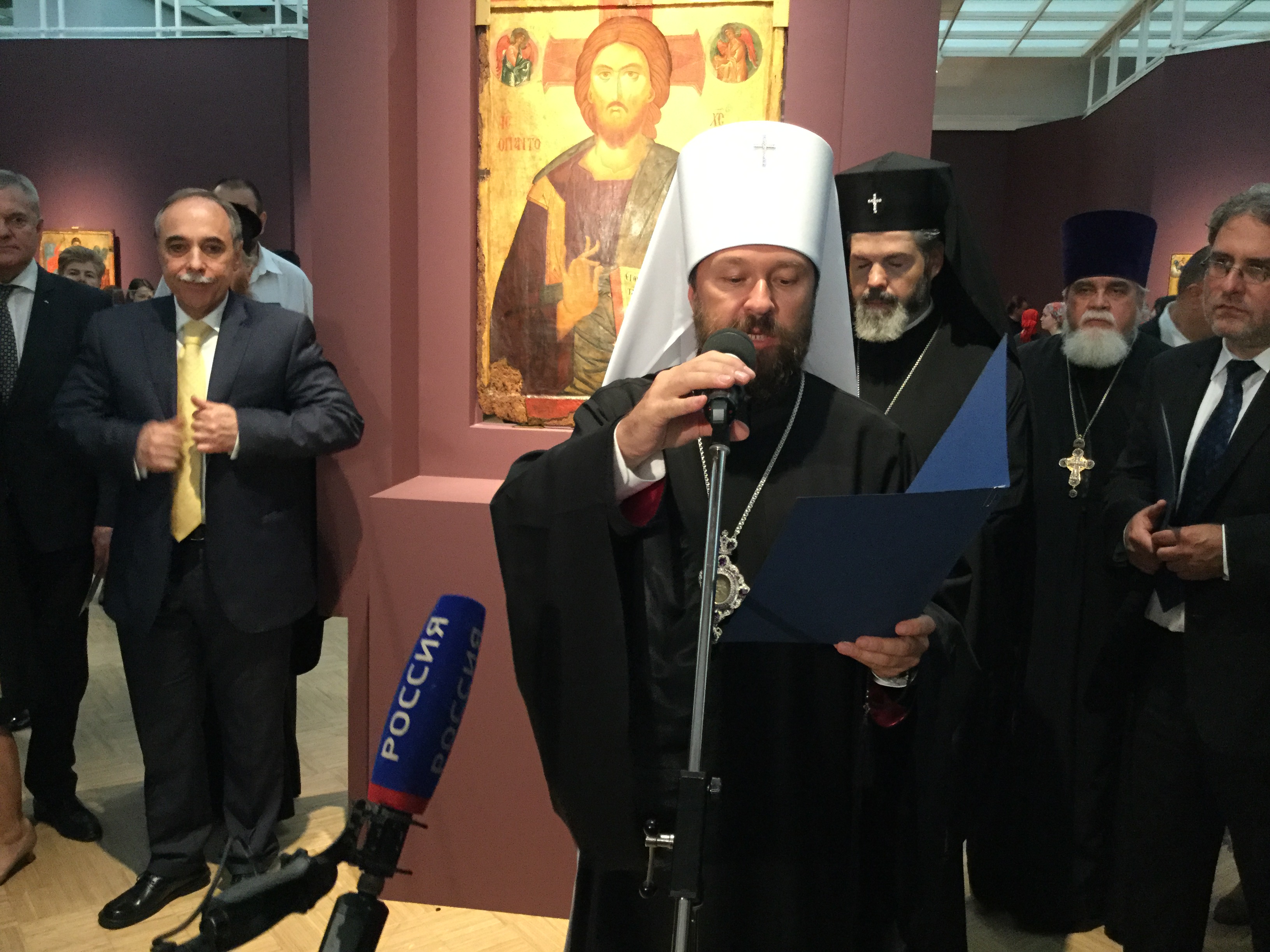 Официално изложбата бе открита от посланика на Република България в Руската федерация Бойко Коцев, министъра на културата на България Боил Банов, директора на галерията Зелфира Трегулова и заместник-директора на НИМ Надя Николова. В церемонията по откриването участваха и Западно- и Средноевропейският митрополит Антоний, главният секретар на Светия Синод Мелнишки епископ Герасим, както и ръководителят на Отдела за външни църковни връзки на Руската православна църква митрополит Иларион.