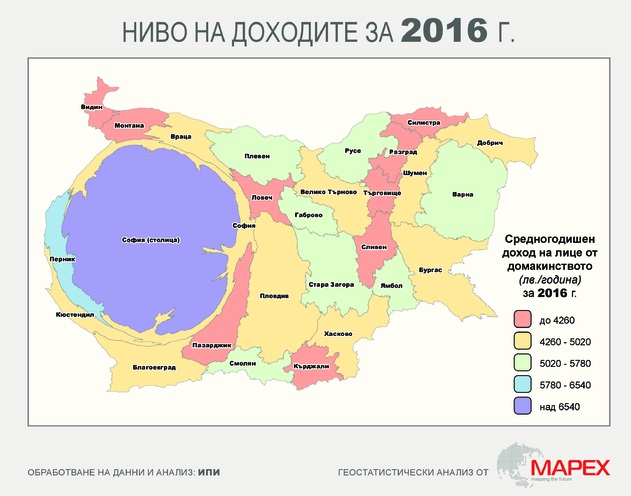 Тази демографска тенденция обаче допълнително разширява цепнатината, която разделя България на по-богата и по-бедна част. На картата, изобразени като благосъстояние, едни области набъбват, а други се свиват. В най-проспериращите области вземат два пъти по-високи доходи от най-изоставащите.