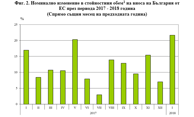 Вносът на България от ЕС през януари 2018 г. се увеличава с 21.7% спрямо същия месец на предходната година и е на стойност 3 226.3 млн. лв. по цени CIF. Най-голям е стойностният обем на стоките, внесени от Германия, Италия, Румъния, Испания и Гърция.