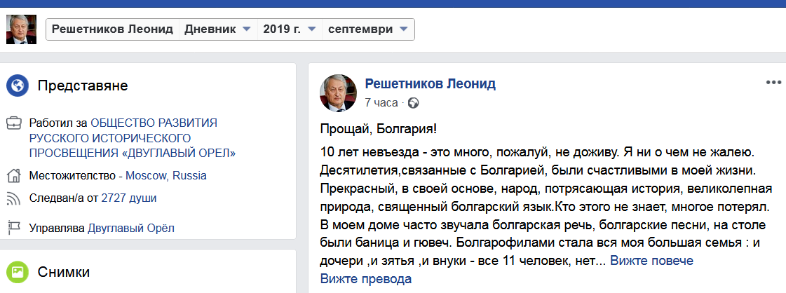 /КРОСС/ Обвиненият в шпионска дейност бивш генерал от КГБ Леонид Решетников вчера написа сърдечен коментар в социалната мрежа, след като се разбра, че прокуратурата му налага забрана да влиза в страната в продължение на 10 години. Ето какво написа Леонид Решетников в социалната мрежа.