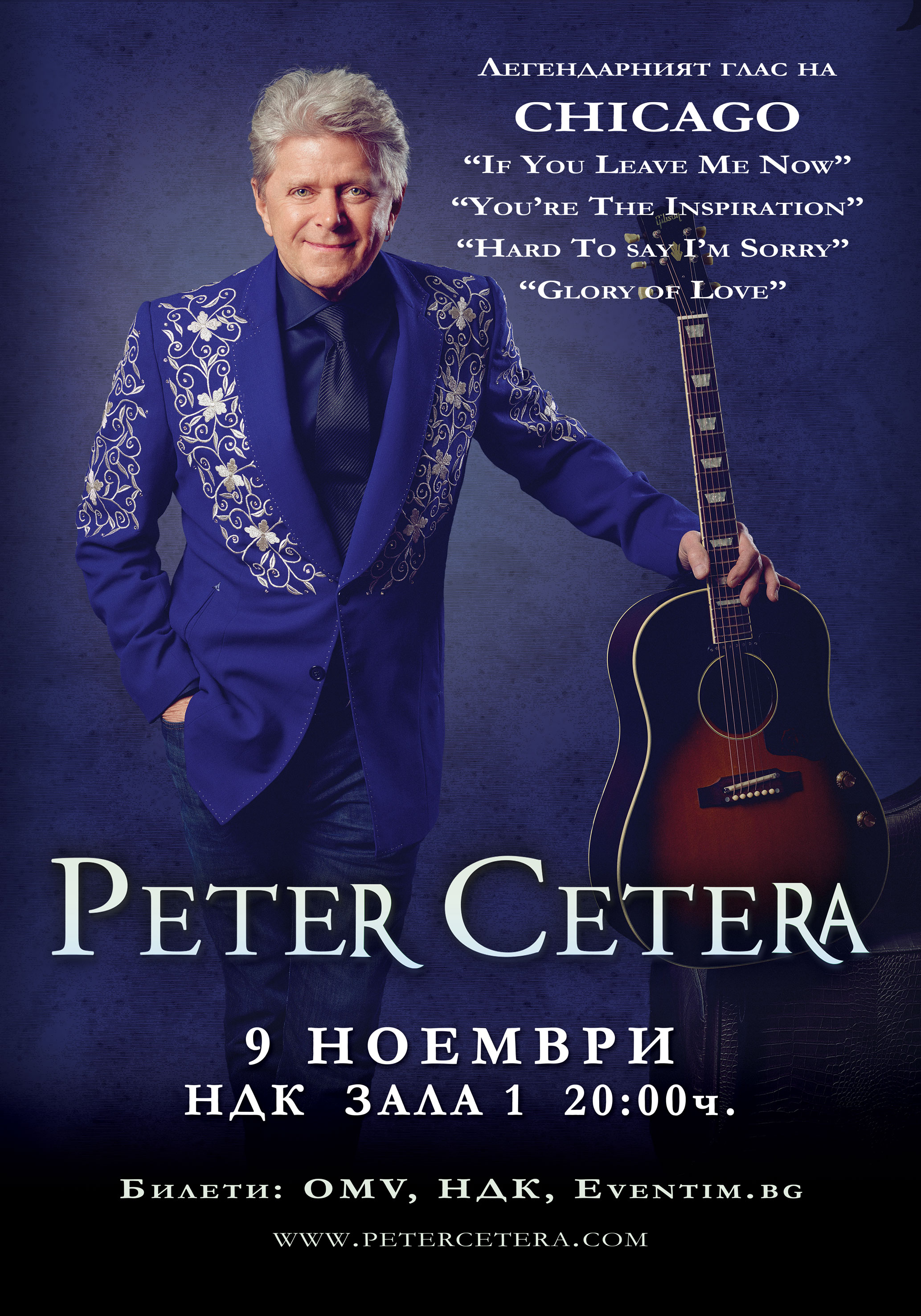 В момента Cetera е на световно турне със своята банда и споделя музиката от 8-те си солови албума, както и най-големите хитове, написани с група Chicago. В България ще имаме удоволствието да го чуем за първи път на живо на 9 ноември в зала 1 на НДК, а билети могат да бъдат закупени от утре, 22 май, на цени от 60 до 140 лв. в бензиностанции OMV, билетен център НДК и мрежата на Eventim.bg