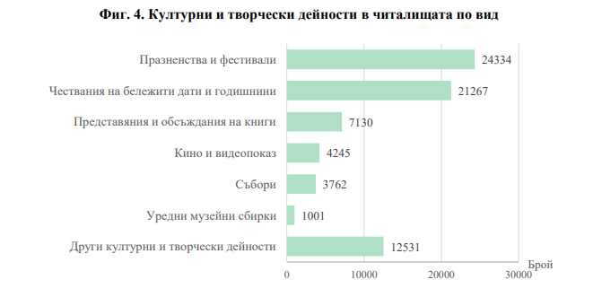 В тази категория най-много са съставите по български народни танци - 2 386, с 44 593 участници и 16 129 изяви; Общият брой на клубовете и кръжоците е 3 077 с 39 375 участници в тях и 13 985 изяви. Преобладават театралните клубове - 548, следвани от тези по приложни изкуства (454) и изобразително изкуство (404). Допълнителна информация е представена в табл. 2 от Приложението. За постигане на целите на читалищната дейност2 , през 2017 г. са организирани общо 37 118 културни и творчески прояви. Най-голям е броят на организираните от читалищата празненства и фестивали - 24 334, следван от честванията на бележити дати и годишнини - 21 267 (фиг. 4).