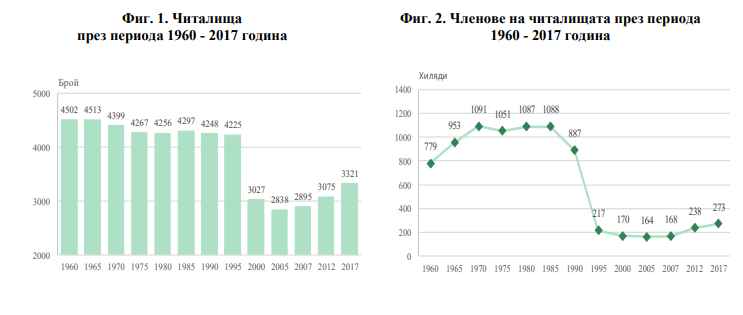 В сравнение с 2012 г. се наблюдава увеличение на броя на читалищата с 246, или 8.0%, съответно със 76 (12.9%) в градовете и със 170 (6.9%) в селата (фиг. 1). Членовете на читалищата са 272 797, като спрямо 2012 г. броят им се увеличава с 34 593, или с 14.5% (фиг. 2).