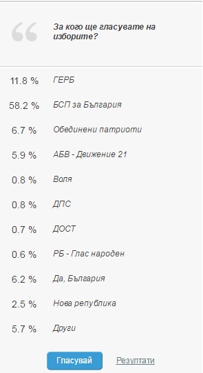 Над 4% са събрали също партиите Обединени патриоти (6.7%), РБ - Глас народен (6.2%) и АБВ - Движение 21 (5.9%). 5.7 % от читателите ни на са припознали никоя от предложените партии като своя избор за управление на страната.