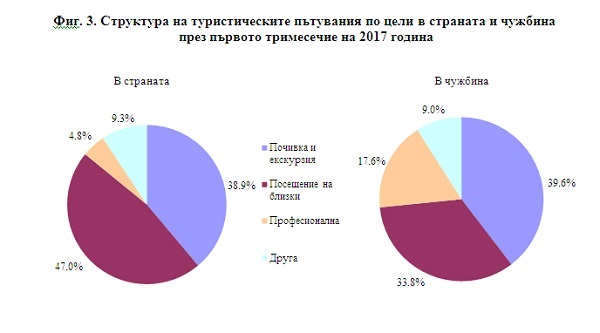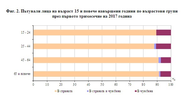 През първото тримесечие на 2017 г. най-много туристически пътувания са реализирани от българите на възраст 25 - 44 години (45.7% от всички пътували лица), като 10.8% от тях са пътували в чужбина. Във всички възрастови групи преобладава относителният дял на пътуванията в страната, като най-висок е този дял при лицата на възраст 65 и повече навършени години - 91.4% от пътувалите в тази възрастова група.