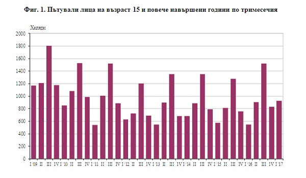 /КРОСС/ През първото тримесечие на 2017 г. 926.1 хил. български граждани са реализирали туристически пътувания, сочи проучване на Националния статистически институт. Преобладаващата част от тях - 89.4%, са пътували само в страната, 9.4% - само в чужбина, а 1.2% са пътували както в страната, така и в чужбина. В сравнение със същото тримесечие на 2016 г. общият брой на пътувалите лица на възраст 15 и повече навършени години нараства с 68.3%, като пътувалите само в страната се увеличават с 80.2%, пътувалите само в чужбина - с 13.3%, докато пътувалите в страната и чужбина намаляват с 20.2%.