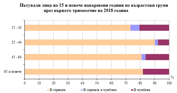 През първото тримесечие на 2018 г. най-много са пътували българите на възраст 25 - 44 години - 441.6 хил., или 44.1% от всички пътували лица. Във всички възрастови групи преобладава относителният дял на пътуванията в страната, като най-висок е този дял при лицата на възраст 25 - 44 години - 90.0% от пътувалите в тази възрастова група. При пътуванията в чужбина делът на пътувалите лица на възраст 15 - 24 години е най-голям - 20.5% от пътувалите в съответната възрастова група.