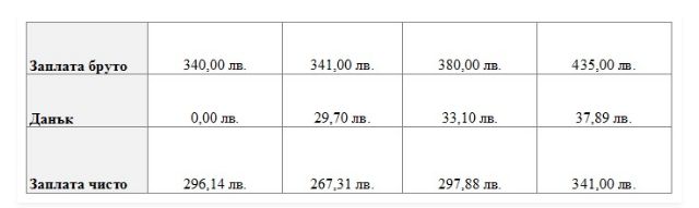 Най-ярка е вредата за служителите със заплати малко над минимума. 341лв. в трудовия договор означава, че дължат данък и ще получават по-малко, отколкото тези с минимална работна заплата. Така ще изглеждат чистите приходи от заплата при предложения модел: