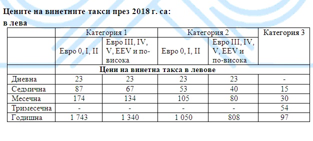 През 2018 г. - за трета поредна година, цените на всички винетки за леки автомобили са непроменени. Годишната е 97 лв., месечната 30 лв., а седмичната 15 лв. За първи път има и тримесечна винетка за леките коли. Цената й е 54 лв. Тя ще позволи на хората, които карат автомобилите си предимно през лятото или по време на по-дълга отпуска или пък не живеят постоянно в страната да използват по-краткосрочен стикер.