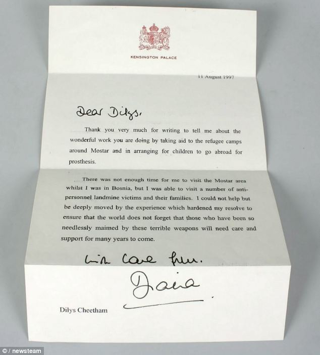 /КРОСС/ Писмо на принцеса Даяна, което тя е написала три седмици преди смъртта си, бе продадено на търг за около 3 000 паунда (5 хил. долара). Последното й официално писмо е написано на бланка на Кенсингтънския дворец и подписано лично от нея. То е адресирано до хуманитарна организация и е посветено на кампанията срещу противопехотните мини. В него принцесата споделя своите впечатления, придобити по време на тридневното си посещение в Босна, където е разговаряла с хора, пострадали от мини.