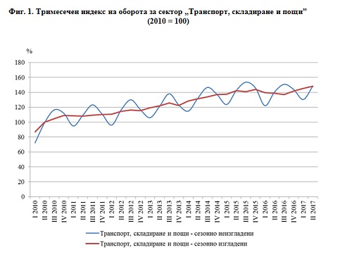 По предварителни данни през второто тримесечие на 2017 г. общият индекс на оборота за сектор „Транспорт, складиране и пощи", изчислен от сезонно изгладени данни, се увеличава с 2.4% спрямо първото тримесечие на 2017 година. Най-висок ръст е регистриран при „Пощенски и куриерски услуги " - с 5.5%. Намаление се наблюдава при дейностите „Воден транспорт" и „Въздушен транспорт", съответно с 12.5 и 1.3%.