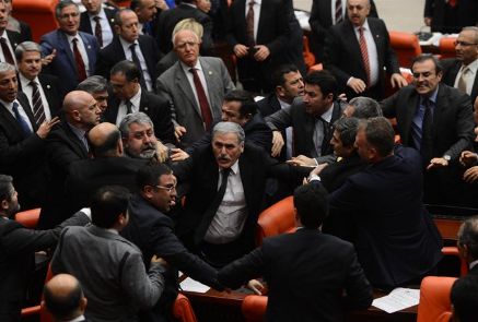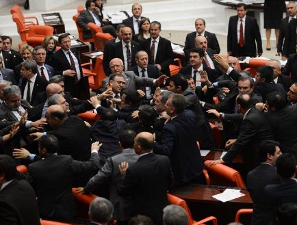 Споровете на трибуната прераснали в масов бой между депутати. В мелето се включили избраници от управляващата "Партия на справедливостта и развитието" (ПСР) и основната опозиционна "Народнорепубликанска партия" (НРП).