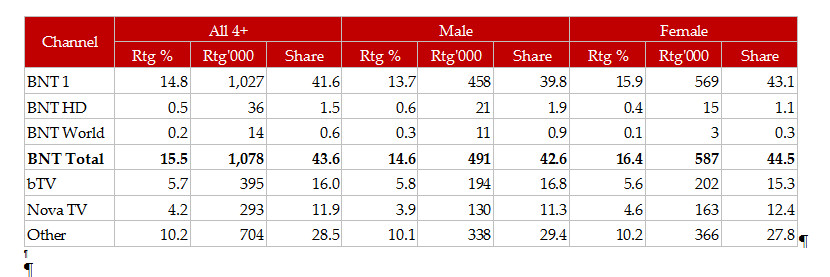 Впечатляващото шоу бе гледано от 1 078 000 зрители по БНТ1, БНТ HD и БНТ Свят, а публиката в зала „Арена Армеец" бе близо 8 хиляди души.
