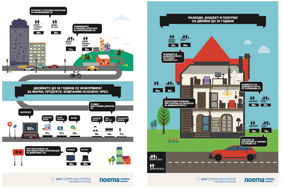Младите двойки до 35 години в България търсят информация за продукти и компании в Интернет, но при противоречиви данни се доверяват повече на телевизията. Това показват резултатите от проучване „Съвременните двама" за ролите на партньорите в съвременните двойки за осигуряване на приходи, вземане на решения за покупка и в домакинството. Провеждането на изследването е съвместен проект на агенция за маркетингови проучвания Ноема и PR агенция AMI Communications България.