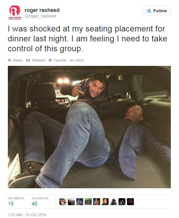 На нея се вижда как Рашийд е легнал в багажника на автомобил, а Димитров го сочи усмихнат от предната седалка, предаде Gong.bg. „Бях шокиран от мястото ми за вечеря снощи. Чувствам, че трябва да наложа контрол на тази група", пише треньорът под снимката.