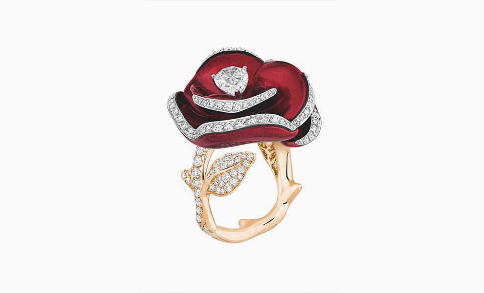 Функционалната част на пръстена вече е позната на всички нас от колекцията Pré Catelan - те са направени под формата на завити розови стъбла с леки намеци за бодли и миниатюрни листенца.