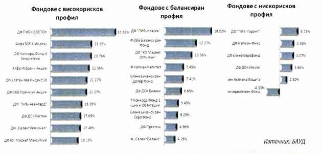 Според данните от Българската асоциация на управляващите дружества (БАУД) почти всички фондове в страната са постигнали положителна доходност през 2016 г. При фондовете с високорисков профил, инвестиращи основно в акции, с най-висока доходност за своите инвеститори се открояват ДФ ПфБК ВОСТОК с ръст на стойността си от 37.65%. На следващо място е управляваният от „Алфа Асет Мениджмънт" SOFIX Indeks с 23.99%, а на трето място по доходност се нарежда Конкорд фонд 4 - Енергетика с 23.76%. При балансираните фондове с най-висока постигната доходност е ПИБ-Класик, който е донесъл на своите акционери 18.02% за 2016 г. След него се нареждат ОББ Балансиран фонд с постигната доходност от 12.27% и Юг Маркет Оптимум с 10.58%. При нискорисковите фондове отново на първо място се нарежда управляваният от Първа финансово брокерска къща (ПФБК) фонд ПИБ-Га-рант с 5.73% доходност за 2016 г.