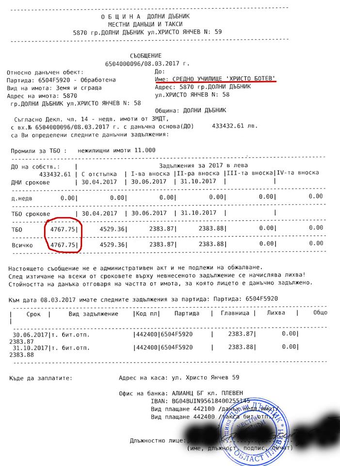 "5000 лева такса „БИТОВИ ОТПАДЪЦИ" за 2017 година трябва да заплати ОБЩИНСКОТО Средно училище „Христо Ботев" на собствената си Община Долни Дъбник!
