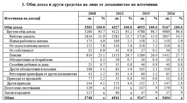 През периода 2008 - 2016 г. са регистрирани следните по-важни изменения по отношение на източниците на общия доход средно на лице от домакинство:
