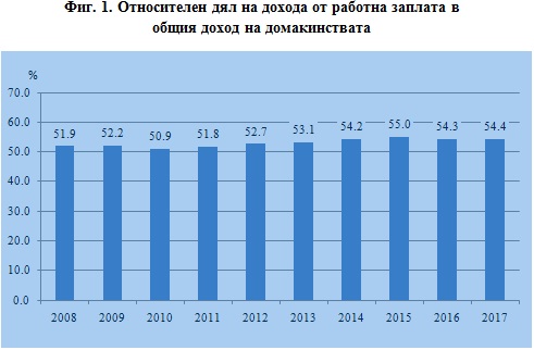 В структурата на общия доход с най-висок относителен дял е работната заплата. През 2017 г. той е 54.4%, което е с 0.1 процентни пункта повече в сравнение с 2016 г. и с 2.5 процентни пункта -спрямо 2008 година.