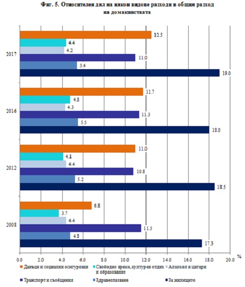 Относителният дял на разходите, свързани с жилището, нараства през 2017 г. спрямо 2016 г. с 1.0 процентен пункт, а в сравнение с 2008 г. увеличението е с 1.7 процентни пункта.